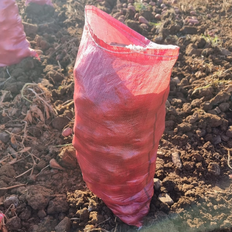 Red woven bags for packing potatoes